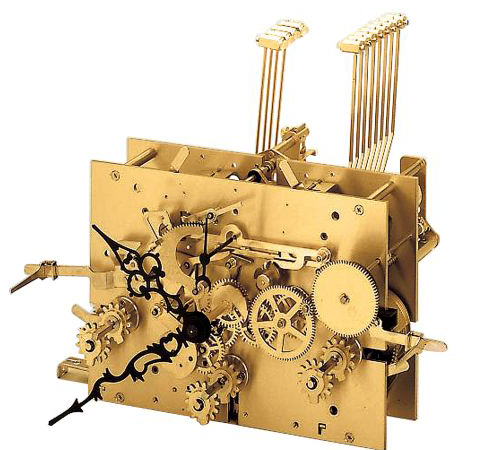 1/4 Seilzugumschaltwerk mit 3 Melodien (Westminster, St. Michael und Whittington) auf 16-Stabgong, Gangdauer 7 Tage, Platinenmaß 142 x 200 x 2,5 mm, 6 Aeterna Bronze-Bouchons (Beisatztriebe), austauschbare Seiltrommeln, Palettenanker mit ruhender Hemmung (Graham) und Ankerautomatik, Seilaufzugsbegrenzungen, Gegengesperr (Gangreserve), echte Sekunde, getrennte Schlagabschaltung des Stunden- und Melodieschlages mit Gewichtsablauf und automatische Nachtabschaltung zwischen 22.00 und 7.15 Uhr, integrierter Zifferblatt-Verschlußhebel.