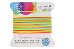 Farbenfrohe, bunt gefärbte Perlseide für das kreative Knüpfen von lebendigen Edelstein- und Perlenketten, Armbändern und anderen Schmuckstücken voller Lebensfreude. Mit fest integrierter Nadel für müheloses Auffädeln der Perlen.