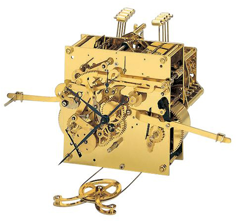 1/4 Seil-/Federzug-Pendelwerk mit Westminsterschlag auf 8-Stabgong, Gangdauer 7 Tage, Platinenmaß 131 x 131 x 2,0 mm, 4 Aeterna Bronze-Bouchons (Beisatzräder Schlagwerke), Palettenanker mit ruhender Hemmung (Graham) und Ankerautomatik, Sicherheitsaufzugsgesperr (Schlagwerke), Sekundenanzeige, Schlagabschaltung und automatischer Nachtabschaltung zwischen 22.00 und 7.15 Uhr.
