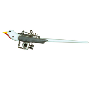 aus Kunststoff mit eingefärbten Flügeln, beweglichem Schnabel und Metallfuß mit Schraube.
