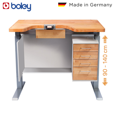 Goldschmiedewerktisch mit massiver Buchenholz-Tischplatte und elektrischer Höhenverstellung.