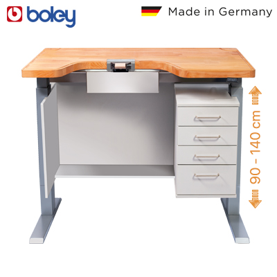 Goldschmiedewerktisch mit massiver Buchenholz-Tischplatte und elektrischer Höhenverstellung