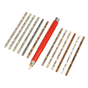 Steinfeilen zum Polieren oder Schleifen in verschiedenen Steinarten und Körnungen. Inklusive Stifthalter mit Vorschub.