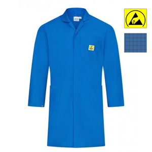 Hochwertige, leichte, atmungsaktive Arbeitskittel mit angenehmer Trageeigenschaft, sowie Druckknopfverschluß mit verdeckter Knopfleiste. Maschinenwaschbar bis 60°C. Elektrostaitsch ableitfähiges Mischgewebe aus 63% Polyester, 33% Baumwolle und 4% leitfähige Faser (PES/Carbon). Die Leitfähigkeit ist bis 60 Waschungen noch im Rahmen der Norm.