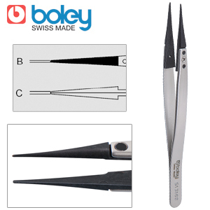 Präzisions-Kornzangen aus Schweizer Produktion in bester Verarbeitungsqualität. Antimagnetisch aus rostfreiem Edelstahl mit speziell gefertigten Carbonfaser-Spitzen. Ideal für Arbeiten an empfindlichen Bauteilen, wie z.B. Platinen, Brücken, elektronischen Bauteilen usw., wo Kratzer und Beschädigungen zu vermeiden sind. Hitzebeständig bis 300°C, sowie wiederstandsfähig gegen Chemikalien und agressive Lösungen. Spitzen auswechselbar.