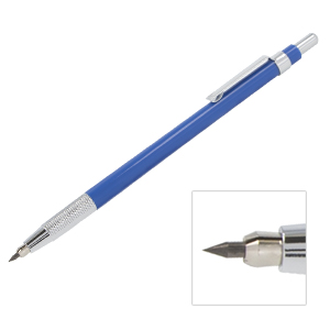 Handliche Reißnadel in Kugelschreiberform mit auswechselbarer Hartmetallspitze. Die kräftige Spannzange sichert während der Arbeiten den festen Sitz der Nadel. Erst nach betätigen des Druckknopfes gibt die Vorschubmechanik die Nadel wieder frei und transportiert sie Schritt für Schritt nach vorne.