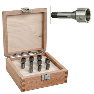 Spannzangensatz vorgebaut 10-tlg. mit Schaft-Ø von 8,0 mm in massiver Buchenholzkiste. Zusammenstellung der gängigsten Spannzangen von 5 x 4 - 14 x 11 mm.