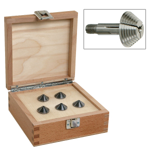 Ringfuttersatz 5-tlg. mit Schaft-Ø von 8,0 mm in massiver Buchenholzkiste. Zum Schnellspannen ringförmiger Teile. Stufendurchmesser von 11.30-25.00mm, Abstufung 0.20mm, Stufenhöhe 0.70mm.