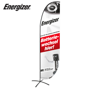 Machen Sie auf Ihren Batteriewechsel aufmerksam und generieren Sie zusätzlichen Umsatz. Formschöner Straßenaufsteller von ENERGIZER als Segelform.