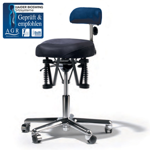 Funktionsdrehstuhl mit Sattelsitz, kurzer Rückenlehne und integriertem Bioswing 3D-Sitzwerk. Das neuartige gepolsterte Sitzsystem verfügt über integrierte Schwingelemente, die Ihre eigenen Bewegungen (Atumung, Herzschlag, etc.) unterstützen und wirkungsvoll absorbieren. Dadurch werden die Rücken- und Beckenregion inklusive den Bandscheiben zuverlässig von Druck und Starre befreit und es verleiht Ihnen somit ein höchst enspanntes Körpergefühl und ein ermüdungsfreies Arbeiten im Schulterbereich. Gleichzeitig vermeiden Sie Verhärtungen in der Nacken- und der Rückenmuskulatur.