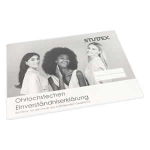 Ohrlochstechanwendung und Einwilligungserklärung DIN A4 neue Ausführung zum Ohrlochstechen. Mit dabei ist eine Pflegeanleitung für den Endkunden.