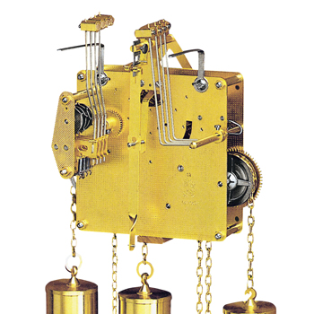 8 Tage Kettenzugwerk mit Pendel und 4/4 Westminster auf 8 Stab Gong. Die 8 Hämmer sind hinten angebracht. Schlag alle 1/2 Stunden einmal und alle Stunden voll.