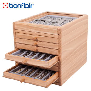 54 Metallbänder in gängiger Sortierung, je 6 Stück in 9 Laden (davon eine Lade oben sichtbar). Bänderdisplay bestehend aus 6 x 6 = 36 Herren- und 3 x 6 = 18 Damen-Metallbändern in Edelstahl, Bicolor und HiTecGold (mit 5-Jahres-Garantie).