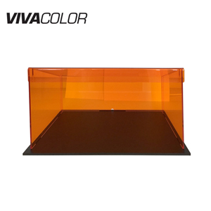 Lichtschutzbox, zum Schutz der Farben während der Verarbeitung. Die Scheiben sind orange getönt, wodurch UV- und Blaulicht gefiltert wird. Die Farben werden so vor ungewollter und vorzeitiger Aushärtung durch das Umgebungslicht geschützt. Idealerweise wird die Box mit der geschlossenen Seite gegen die Lichtquelle ausgerichtet.