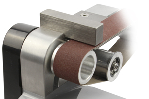 Ideal zum Vor- und Feinschleifen der Werkstücke direkt an der Werkbank. Der Bandschleifer ist dank seiner Kugelaufhängung frei kipp- und neigbar.