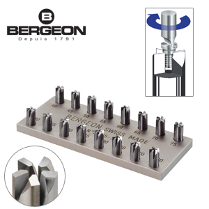 Verschiedene Werkzeuge zum Fräsen von Ansatzschrauben für Chronographen aus Hartmetall. Sortiment von 16 verschiedenen Fräsern auf stabiler Grundplatte.