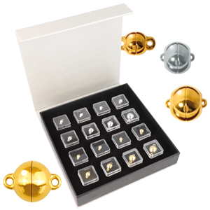 16 gängige, hochwertige und polierte Magnetschließen ind Silber und Silber vergoldet.