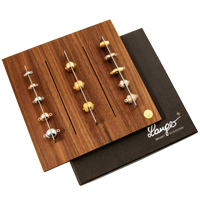 Das Magnetschließen Display System besteht aus einer Edelstahl-Nussholz-Aufsteller/Vorlagenhilfe sowie einer Aufbewahrungs-/Aufstellbox mit auswechselbaren Edelstahlstreifen.