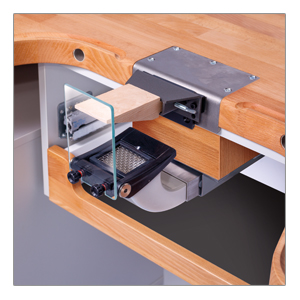 Absaugvorrichtung ausziehbar und abnehmbar, ideal zum Absaugen von Feilspänen, Staub und Dreck beim Bearbeiten Ihrer Werkstücke. Die Absaugung kann per Auszug in die gewünschte Position gebracht werden, ein Gittereinsatz schützt davor das Schmuckstücke nicht in den Absaugkanal gelangen. Die bewegliche Schutzscheibe sorgt für optimale Sicherheit. Optinal ist auch der Einsatz eines Goldfilters möglich.