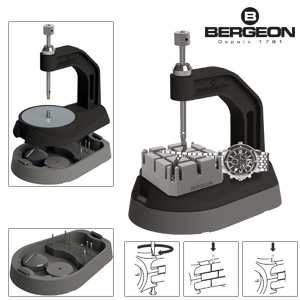 Praktischer Multifunktions - Bänderpressstock B-Press aus dem Hause Bergeon zum Ein- und Ausschlagen der Bandsplinte, sowie zum Ein- und Ausschrauben von Armband-Schrauben. Der Untersatz aus synthetischem Material ermöglicht es, Uhren mit Metall- und Lederbändern exakt in Position zu halten. Der praktische Untersetzer aus Kunststoff, dient zur Aufbewahrung des Zubehörs oder als Aufsteller während des Einsatzes des Stiftausschlägers. Vier antirutschfeste Gummifüße halten die Multifunktionspresse in Position.