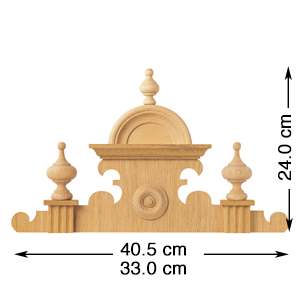 Buche furniert und vorgeschliffen, mit losen, gedrechselten Zierteilen. Die beiden Konsolen links und rechts können auf einen Abstand von 23.5cm bis 28.0cm (Mitte/Mitte) aufgeleimt und so einem Gehäuse optimal angepasst werden. Die Gesamtbreite von 40.5cm ist bis auf 33.0cm einkürzbar.