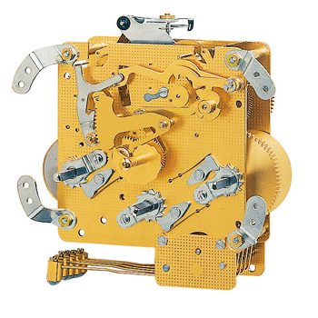 8 Tage Federzugwerk mit Unruh-Gangregler mit 4/4 Westminster auf 5 Stab Gong. Die 5 Hämmer sind unten angebracht.