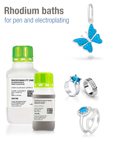 Rhodium baths “Rhoduna” of the brand Umicore have been added to our programme. Umicore is one of the world's leading processors of special chemicals and has taken over the production of rhodium baths from Wieland Edelmetalle. In the course of the changeover, a new combination rhodium/platinum bath was also launched, which is available under Boley Art.-No. 695641 as “Rhoduna PT One”. This special bath with a proportion of Pt 0.7g and RH 0.3g is characterised by a very advantageous price with a consistently assured gloss and anti-tarnish effect. All “Rhoduna” rhodium baths are operated with platinised titanium anodes.