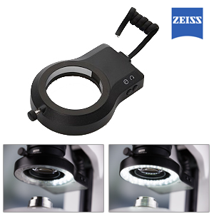 Zeiss ring light K LED segmentable suitable for the Stemi 305 and 508. The shadow-free ring light offers four different modes: full, half, quarter circle or 2 opposite quarter circles.