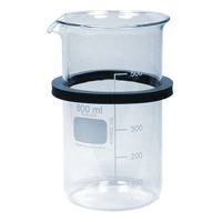 Beakers made of glass with plastic ring to hang in perforated lid.