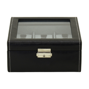 High quality watch collector box with large glass viewing window, suitable for 6 watches. Leather look handcrafted, interior made of fine synthetics with lockable lock.