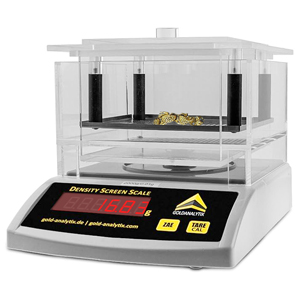 The DensityScreenScale is the universal solution to this question because regarding the density, a gilded brass ingot differs extremely from the one of pure gold. The density is determined by the tried and tested method by Archimedes. To do so, the object is weighed with a filter under water, then “normally” and then the measurement is already done! These two different values allow you to immediately establish the density using a simple formula for your calculator.