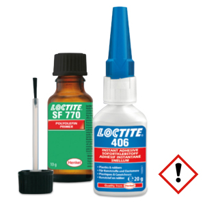 Loctite Polyolefin Bonding Set consist of LOCTITE 406 for bonding plastics and elastomers when very fast fixing is required and LOCTITE SF 770, a primer for pretreating polyolefins or other low surface energy materials so they can be bonded with Loctite 406. Ideal for bonding Junghans band tendons, elastic plastic or rubber watch bandsm and repairing rubber material.