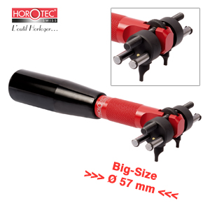 Universal key for water-resistant watches. The width of the key can be adjusted and locked with a single knurled screw up to a diameter of 57 mm. The case opener can thus also be used on Big-Size watches, where normal case-openers do not open far enough. The transverse to the mounting jig enables precise and powerful opening or closing of the watches.