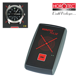 Compact watch tester enables easy testing of analog quartz watches. Using a visual and audible signal indicates whether the coil or circuits is in order. Without auto electronics is defective or the battery empty.