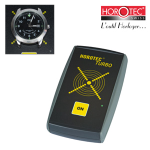 Compact watch tester enables easy testing of the gears analog quartz watches. The wheels can be unblocked by pressing the "On" button. To be possible to turn the wheels, the button for the desired time must be kept.