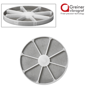 Cleaning basket made of plastic with Ø 80mm, stainless steel mesh and 8 cseparations. Suitable for Greiner Vibrograf ACS900 / ACS921.