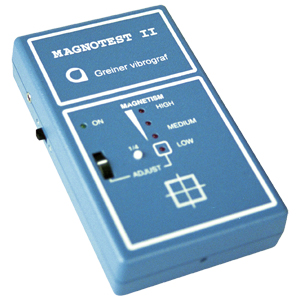 This measuring instrument is used to determine the residual magnetism in a watch or parts of a watch, such as balances, coils, screws or other spare parts. The display is made by means of four light-emitting diodes.
