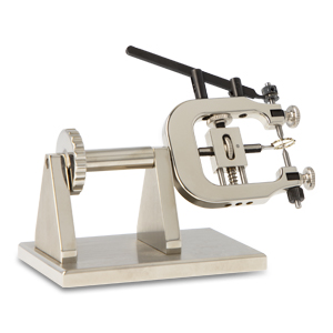 Professional truing caliper from Swiss production with exchangeable pivot protectors on turntable. With this tool, balances as well as various wheels can be aligned again. The alignment is done by a precisely adjustable height compensation, as well as various adjustment possibilities on the pivot protectors. The exact insertion of the wheels is done by pressing the clamping lever. The turntable allows quick inspection from all sides. Swiss-Made.