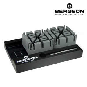 Practical holding device with two plastic supports for holding bracelets when shortening. The two bracelet holder can be easily moved and adjusted to the correct position on the wooden base. Also ideal for watches with rigid and curved bracelets. Swiss Made.