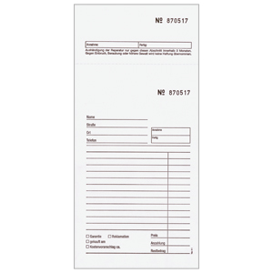 Repair job envelopes with tear-off, doublicate numbered, with security adhesive.