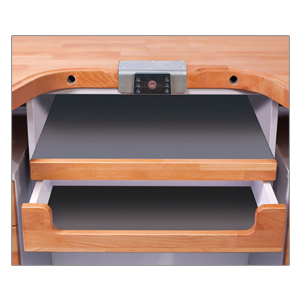Extendable filing drawer for collecting filing chips, incl. extendable worktop. The filing drawer and the worktop are both black.