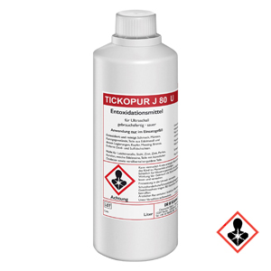 Ready-to-use deoxidation solution Tickopur J80U with tarnish protection for precious metals, jewellery and coins. Removes oxide and sulphide layers, fluxes, oils and greases. Cyanide-free solution for ultrasonic devices, but also suitable for immersion and wipe cleaning.