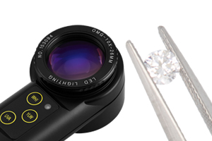 Control magnifier with LED illumination for examining surfaces, gemstones, watches and jewellery.