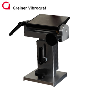 Support table from Greiner Vibrograf with height and tilt adjustment suitable for the multifunction machine SL2. This is fixed in the guide on the base plate of the lapping machine by means of a knurled screw and is freely adjustable.