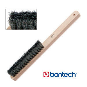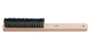 The handbrush has steel metal bristles in four rows and a wooden handle.