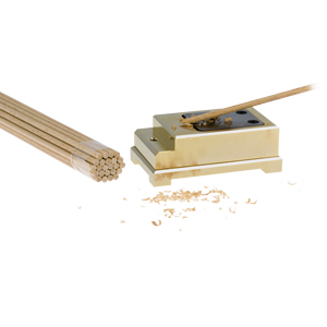 Solid sharpener made of milled brass with hardened blade for precise sharpening of pegwood.