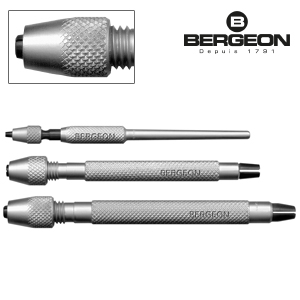 Pin vices with chrome-plated handle and round head, as well as two interchangeable collets of hardened steel. Very smooth thread. Swiss-Made.