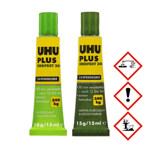 Two-part adhesive (binder and hardener) based on epoxy-resin, bonds almost permanently all hard materials such as metals, glass, porcelain, stone, wood etc.