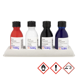 Assortment of hand lacquers on a practical table stand for effortless lacquering of hands or index numbers. This assortment contains four different ready-to-use colours. The paint is highly opaque and quick drying.