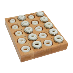 This additional device for facet and patterned rings is a special accessory for wedding ring sizing machines for enlarging and reducing wide flat and patterned wedding rings. The set consists of ten dies, each with twenty plastic sleeves.